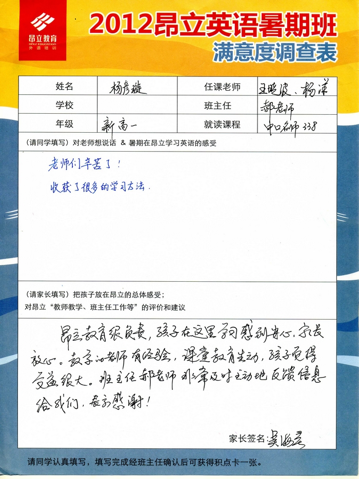 昂立教育 > 項目總攬 > 基礎口譯 > 學習體會 > 2012昂立英語暑期班滿意度反饋表-楊彥璇