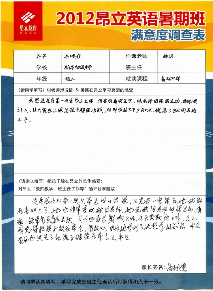 2012昂立英語暑期班滿意度反饋表-朱昳佳