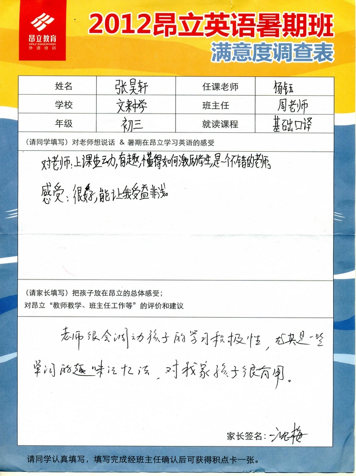 昂立教育 > 項目總攬 > 基礎口譯 > 學習體會 > 2012昂立英語暑假班滿意度反饋表-張昊軒