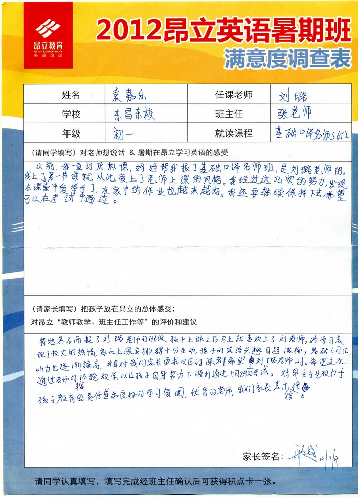 昂立教育 > 項目總攬 > 基礎口譯 > 學習體會 > 2012昂立英語暑假班滿意度反饋表-袁嘉樂