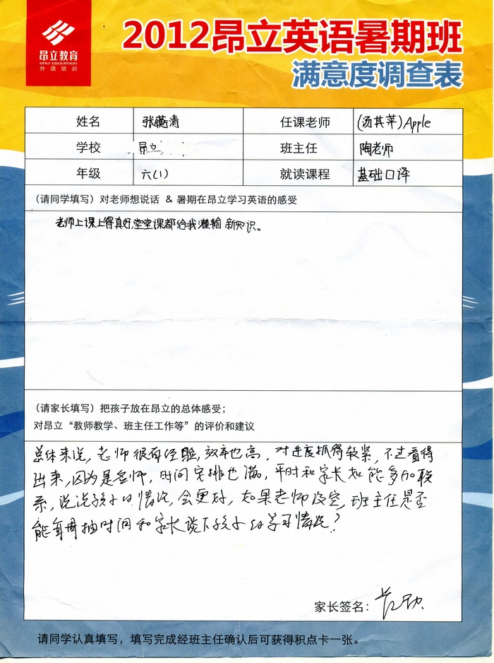 昂立教育 > 項目總攬 > 基礎口譯 > 學習體會 > 2012昂立英語暑假班滿意度反饋表-張蘅清