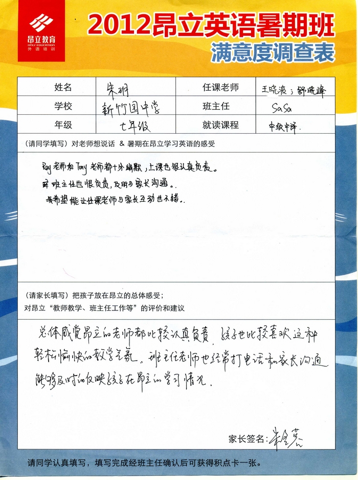 2012昂立英語暑假班滿意度反饋表-朱玥