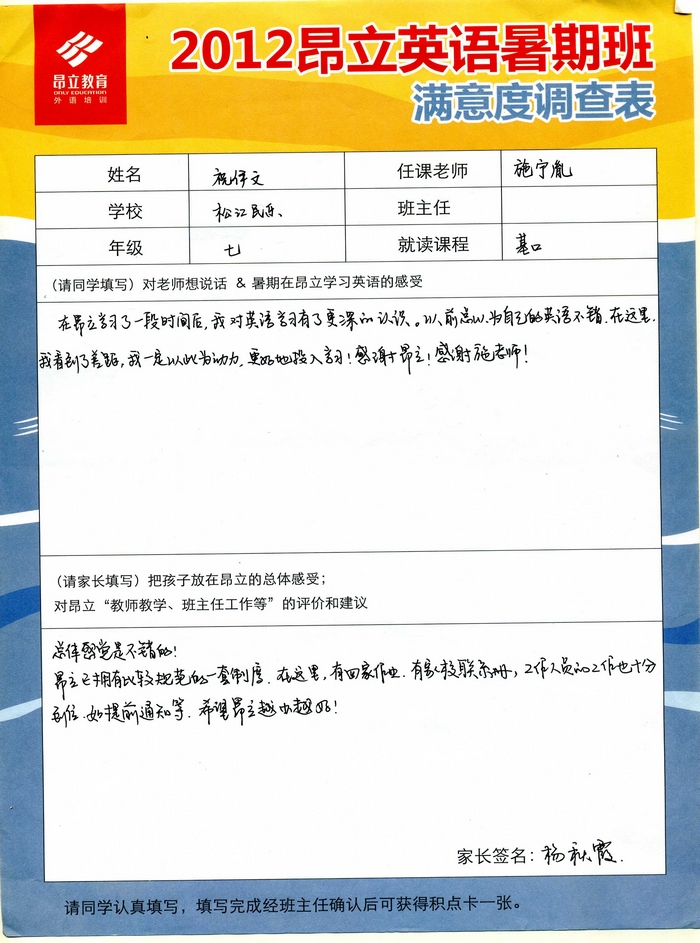 昂立教育 > 項目總攬 > 基礎口譯 > 學習體會 > 2012昂立英語暑假班滿意度反饋表-祝伊文