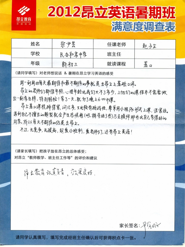 昂立教育 > 項目總攬 > 基礎口譯 > 學習體會 > 2012昂立英語暑假班滿意度反饋表-宗尹蕓