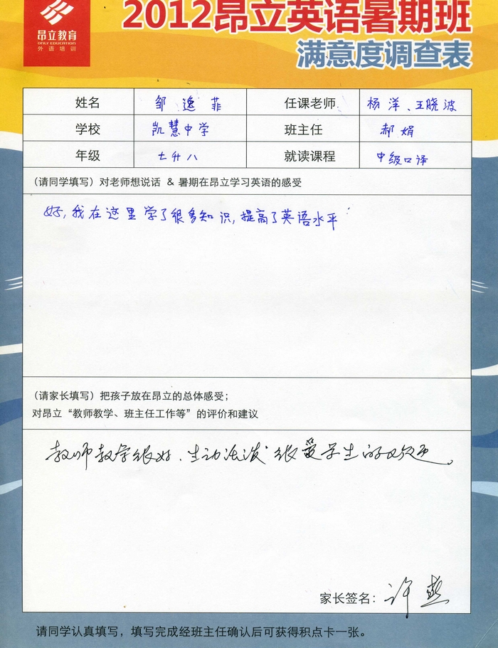 昂立教育 > 項目總攬 > 基礎口譯 > 學習體會 > 2012昂立英語暑假班滿意度反饋表-鄒逸菲