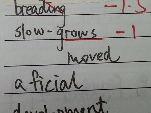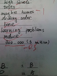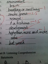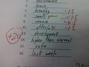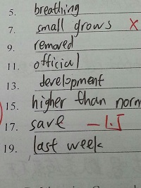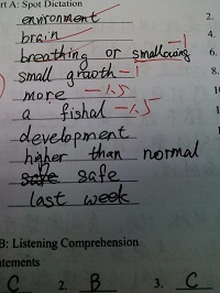 此類錯誤多是在聽單詞的時候將一個詞聽成另外一個詞,如brain聽成了bring, breathing寫成了bigging, bone更是有同學寫成了brownborn。