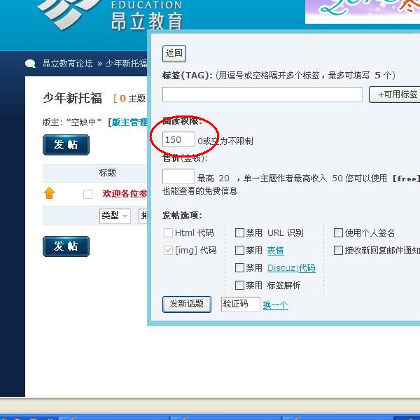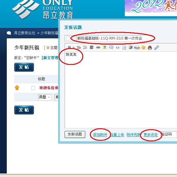 5.在少年新托福版塊中發帖,標題為在讀的班級+第幾節課作業,內容為學員的姓名,將音頻以附件的形式上傳,并在“更多設定”中將“閱讀權限”值設為150(加密)