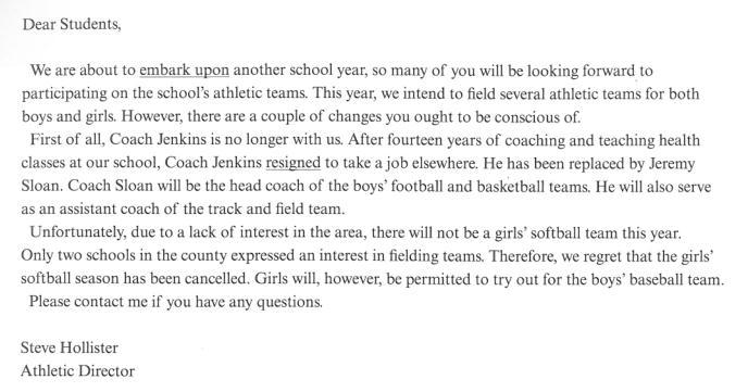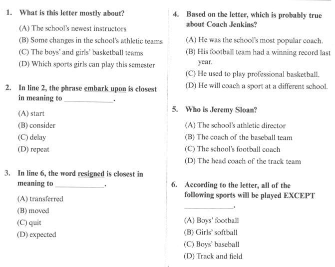 Key: 1B 主旨題,第一段there are a couple of changes you ought to be conscious of. 2A 詞匯題, embark on意思是:start to do sth 3C 詞匯題, resign意思是:quit 4D 推斷題,coach Jenkins resigned to take a job elsewhere, 由于他是教練,推斷出他會制教于另一家球隊。 5C 細節題,第二段“He has been replaced by Jeremy Sloan. Coach Sloan will be the head coach of the boys’ football and basketball teams.”6B 細節題, 第三段“we regret that the girls’ softball season&... |