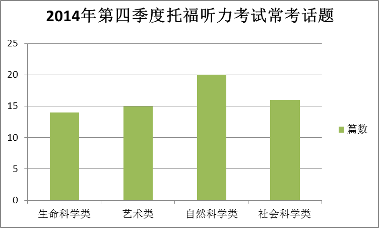 2014第四季度與第三季度相比,自然科學的篇數增加比較明顯?傮w來看,第四季度考試話題分布情況,自然科學最多,出現20篇,生命科學,藝術,社會科學的話題比較平均,各15篇上下。由于ETS成熟的考試模式,四大話題的篇數基本上是保持高度平衡的,但是四季度的自然科學話題比較多,考試可需引起重視,適當在科學性的材料上多下點功夫!上海托福培訓