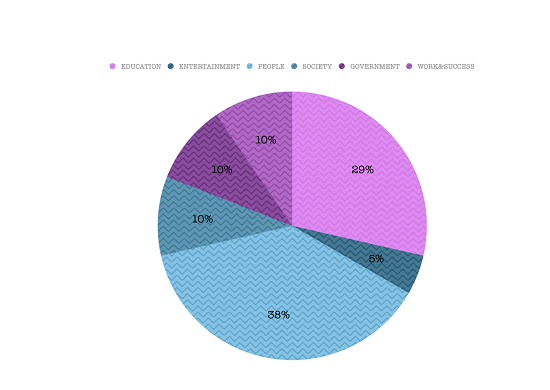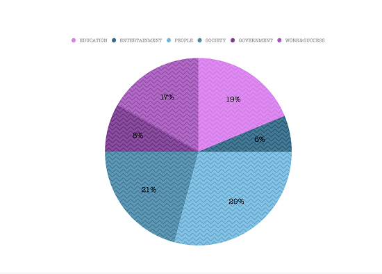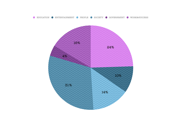 2013全年的49篇題目中,society社會類占到了15篇,education教育類話題占到了12篇,entertainment娛樂類5篇,people人物類7篇,government政府類2篇,work&success 工作和成功8篇。