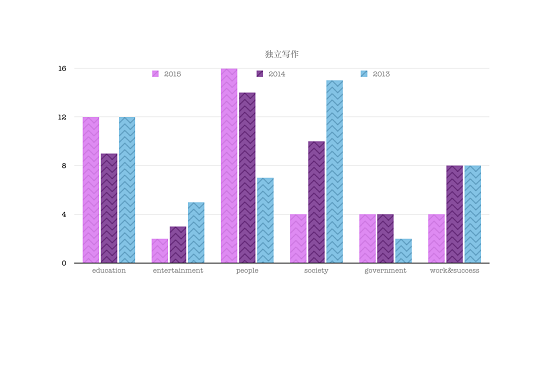 根據這三年的圖表,我們可以發現,在獨立寫作中,占據主要地位的考題類型是education教育類和people人物類,另外幾類占比相對較小。但有一個現象需要關注,那就是某一年都會有一個占比較小的類別比重大幅上升,例如:2013年的work&success工作和成功類,占比16%;2014年的society社會類,占比21%。